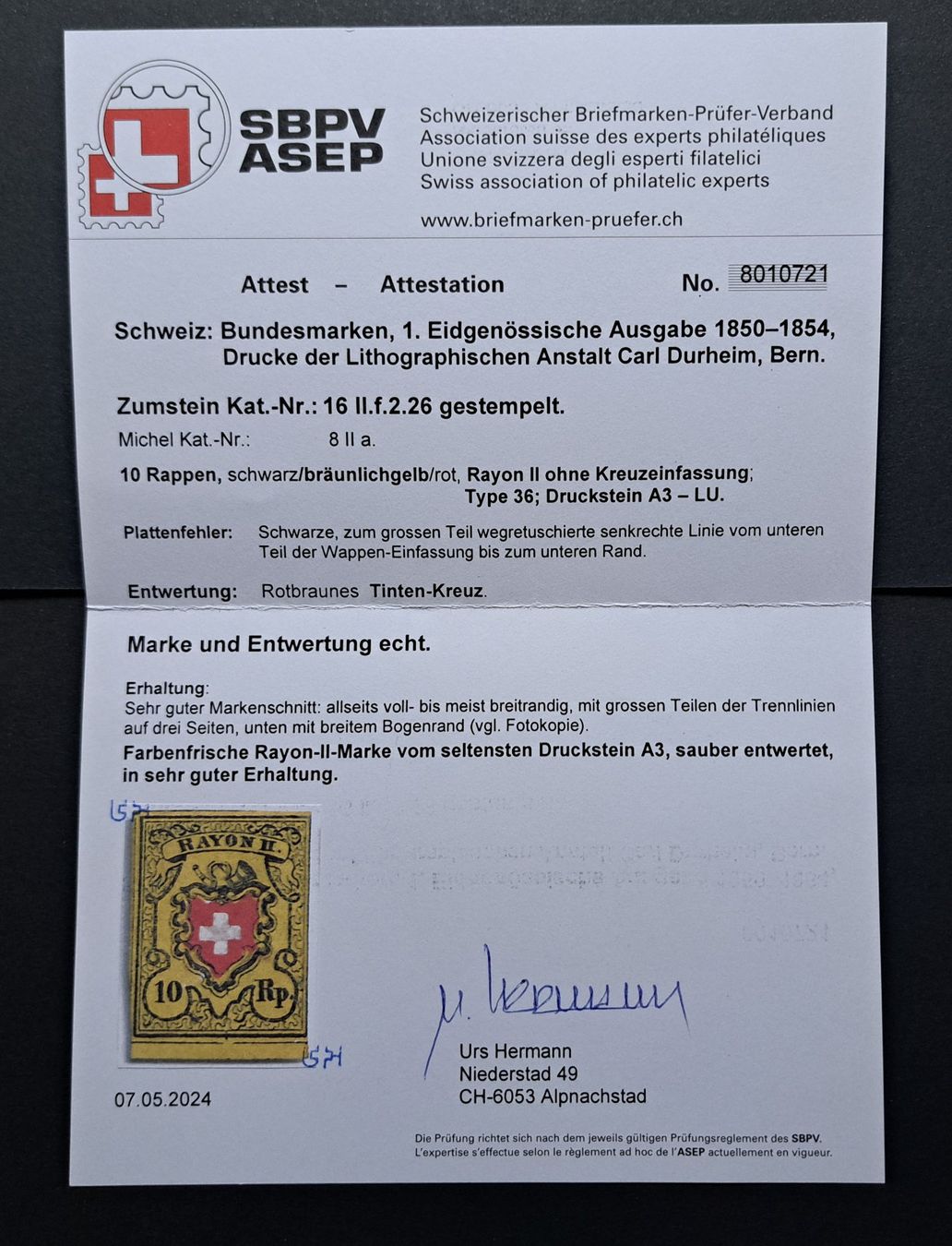 Gemäss Attest eine Zumstein 16 II.f.2.26. Katalogwert CHF 750.- + 200.- für den Plattenfehler.